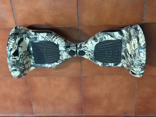 Patinete eléctrico hoverboard con un diseño llamativo de calaveras. - Diseño de calaveras en blanco y negro. - Plataformas antideslizantes para mayor agarre.