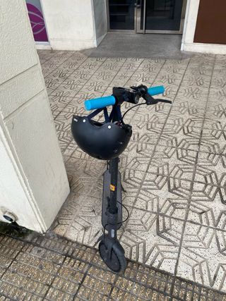 Patinete eléctrico de color negro, ideal para desplazamientos urbanos. - Diseño plegable para facilitar su transporte. - Plataforma antideslizante para mayor seguridad. - Ruedas resistentes para un paseo suave. Sin golpes. Incluye *cargador original* , casco y rueda de repuesto. Autonomía aprox. 25–30 km y velocidad máxima 25 km/h. Ideal para moverse por ciudad, ligero y fiable.