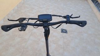 Patinete eléctrico de color negro con manillar azul,Lo entrego con bateria casi nueva de repuesto, pantalla digital nueva,ruedas macisas anti pinchazos , pastillas de freno nuevas,cargador original con solo 2 o 3 uso. - Manillar con puños de color azul. - Rueda delantera y trasera,macizas anti pinchazos . - Plataforma para los pies.