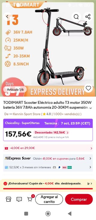Patinete eléctrico Todimart T3 en color negro. Ideal para desplazamientos urbanos.ruedas anti pinchazos.NO REBAJO NI CONTESTO REBAJAS - Batería: 36V 7.8AH - Velocidad máxima: 25KM/H - Potencia: 350W - Autonomía: 20-35KM - Tamaño de rueda: 8.5INCH - Entrega exprés en 3-7 días.