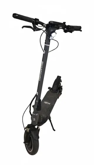 Patinete eléctrico en color gris y negro, con un diseño moderno y funcional. Es plegable, lo que facilita su transporte y almacenamiento. - Manillar con puños texturizados. - Freno delantero y trasero. - Rueda delantera y trasera.