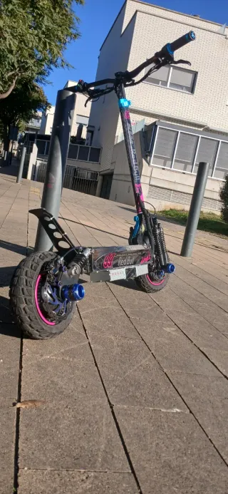 Patinete eléctrico con un diseño robusto y llamativo, ideal para todo tipo de terrenos. - Ruedas todoterreno con llantas de color rosa. - Amortiguación delantera y trasera. - Manillar con puños de color azul. - Detalles de diseño en color rosa y azul. Batería 60v ,frenos nutt, manillar de carbono y mas accesorios