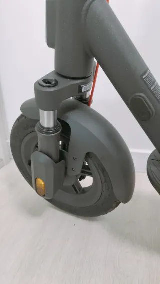Patinete eléctrico Xiaomi en color gris oscuro. Diseñado para desplazamientos urbanos. - Rueda delantera con guardabarros. - Reflectante naranja en la parte delantera. - Manillar con cableado rojo visible.