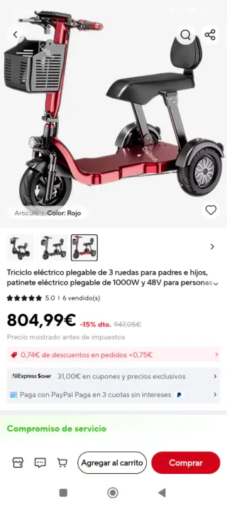 Triciclo eléctrico plegable de 3 ruedas en color rojo. Ideal para desplazamientos cómodos. - Potencia de 1000W. - Batería de 48V. - Diseño plegable para fácil almacenamiento y transporte. Estado nuevo. Lo encargamos por AliExpress y tardó 3 meses en venir, debido a eso cuando llegó el familiar que lo necesitaba ya no lo necesitó. Por eso lo pongo a la venta en estado nuevo. Ha venido en perfectas condiciones y lo vendemos a precio inferior que por AliExpress que está a 800e y lo pueden tener si vienen a buscarlo en el mismo día. Incluso le compré unos tapones para las ruedas metálicos rojos a juego y reposabrazos para niños.