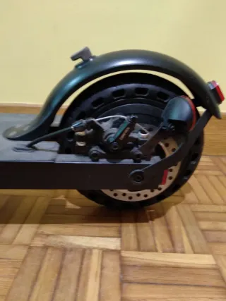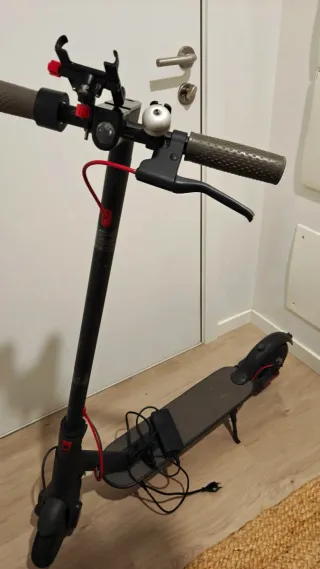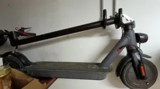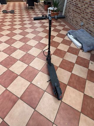 Patinete eléctrico en color negro Con bastante uso. Funciona bien, pero estéticamente está como de se ve. La rueda trasera cambiada recientemente. Es muy similar al Xiaomi 365, el plegado y el cargador son iguales. No está trucado ni nada. Tiene la típica holgura de este tipo de patines, supongo que se podrá ajustar. En el manillar tengo puesto un agarre para la niña, se quita con 4 tornillos. Escucho ofertas que no sean ridículas. No envio.