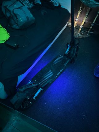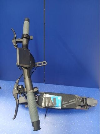 Patinete eléctrico en perfecto estado, listo para usar. - Diseño moderno en gris y azul. - Manillar con puños azules. - Plataforma con diseño gráfico.
