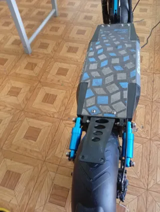 Patineta eléctrica con un diseño moderno y llamativo. - Plataforma con diseño geométrico en azul y gris. - Suspensión delantera y trasera en color azul. - Rueda trasera con guardabarros.