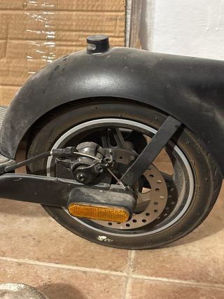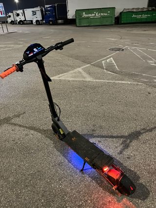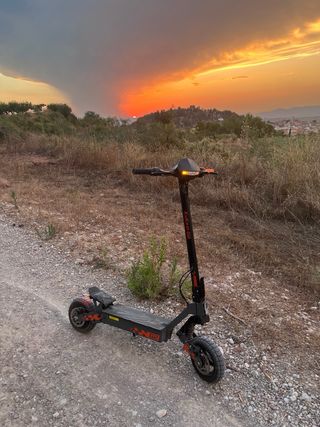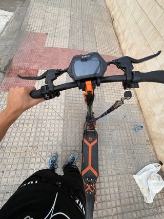 Patinete eléctrico Kukirin G2 Max en color negro y naranja. - Autonomia de 50-70 KM reales. - Velocidad limitable a 25 km/h y deslimitada 55 km/h. -Motor perfeto y ruedas impecables porque han ido por ciudad. -Freno delantero perfecto y trasero frena bastante menos pero se arregla cambiando el muelle. -ALREDEDOR DE 600 KM HECHOS CON DEMOSTRACIÓN EN EL CONTADOR