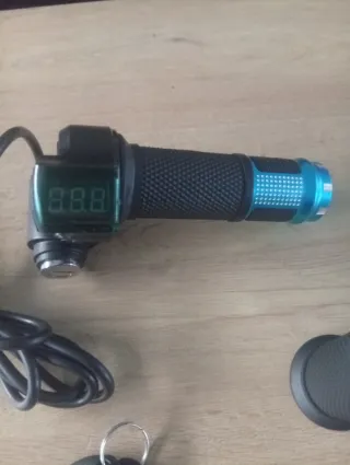 Conjunto de puño de acelerador para patinete eléctrico, con pantalla digital y acabado azul. Incluye dos llaves. - Puño de acelerador con pantalla. - Acabado en color azul. - Incluye dos llaves de contacto.