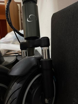 Patinete eléctrico de color negro, ideal para desplazamientos urbanos. - Diseño plegable para facilitar su transporte. - Ruedas delanteras y traseras. - Manillar ajustable en altura. - Esta en perfecto estado un poco rallado el manillar por el uso,y único que hay de cambiar neumático de rueda delantera que está pinchada por todo lo demás está perfecto, tiene el guarbarros, funciona la pantalla, la luz...
