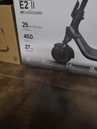 Patinete eléctrico Ninebot E2 II. - Autonomía máxima de 25 km (15.5 millas). - Potencia máxima de 450 W. - Suspensión delantera de 27 mm. - Velocidad máxima de 20 km/h (12.4 mph). - Ruedas de 8.1 pulgadas. - Pantalla de 2.8 pulgadas. - Capacidad de subida de pendientes del 12%. USADO MUY POCO. VENDO POR NO USAR. INCLUYE CAJA, CARTONES, DOCUMENTACIÓN Y CARGADOR. ESCUCHO OFERTAS RAZONABLES POR EL. SALUDOS.