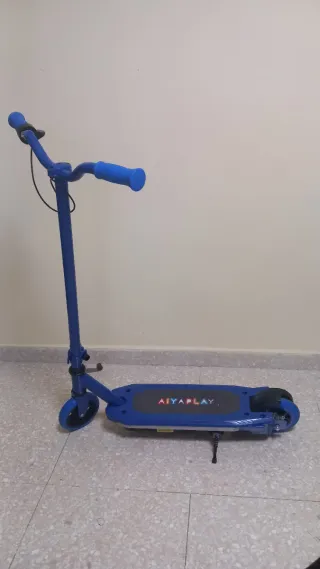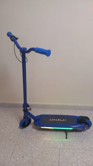 Patinete eléctrico de color azul, con un diseño moderno y llamativo. - Plataforma con logo AIYAPLAY. - Luces LED de colores en la base.