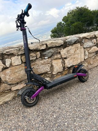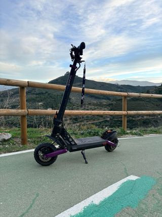 Patinete eléctrico KUGOO G2 Pro en color negro con detalles morados. Lo vendo en este precio para piezas o bien si quieres arreglarlo. - Diseño robusto y deportivo. - Ruedas todoterreno. - Manillar firme
