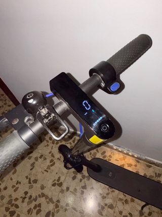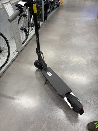 Patinete eléctrico en buen estado. - Color gris oscuro. - Ruedas negras con detalles amarillos. - Pata de apoyo. - Manillar plegable.