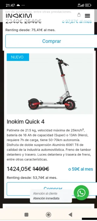 Patinete eléctrico Inokim Quick 4 en color blanco y rojo. - Peso: 21.5 kg - Velocidad máxima: 25 km/h - Batería: 16 Ah (Super) o 13Ah (Hero) - Autonomía: 50-70 km - Doble suspensión - Aluminio 6061 T6 - Freno de tambor delantero y trasero - Luces delantera y trasera acepto cambio por bicicleta de doble suspensión o por otro patín