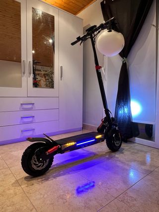 Patinete eléctrico ZWheell con luces LED. - Luces LED de ambiente azul. - Luces intermitentes naranjas. - Doble faro delantero. - Amortiguación delantera y trasera.
