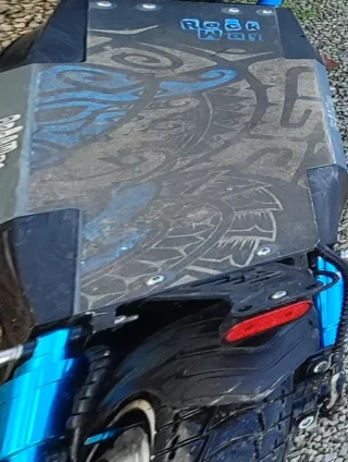 Patinete eléctrico con un diseño llamativo. - Diseño gráfico de dragón y olas en azul. - Superficie antideslizante. - Rueda trasera con guardabarros y luz roja. La día de mantenimiento y con muchos extras