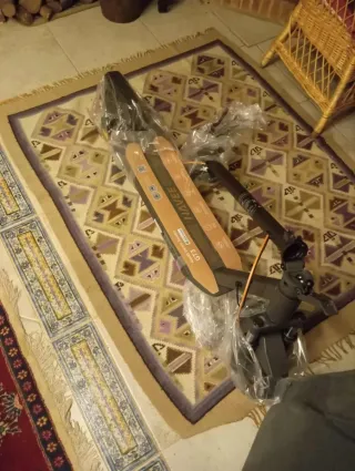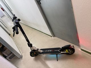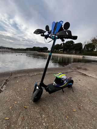 Patinete eléctrico en perfecto estado, listo para usar. - Diseño moderno y funcional. - Manillar con puños de madera. - Pantalla LED azul. - Ruedas negras.