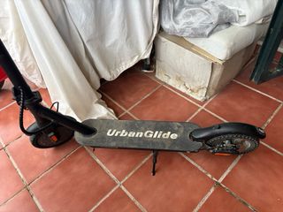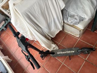 Patinete eléctrico de la marca UrbanGlide. -tiene un problemas - está roto lo de plegar el patín para abrirlo y cerrarlo (no cuesta mucho arreglarlo) está atado de momento con unas bridas - Manillar con puños texturizados. - Plataforma con el logo de la marca. - Rueda delantera y trasera visibles. rueda de atrás anti pinchazos - y le falta el cargador