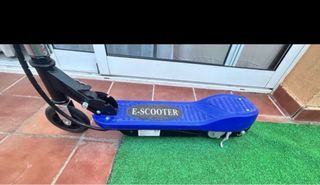 Patinete eléctrico de color azul con la inscripción E-SCOOTER. - Plataforma ancha para mayor comodidad. - Ruedas de goma. - Manillar ajustable.