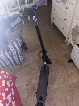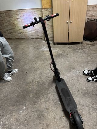 Patinete eléctrico Xiaomi en color negro. Ideal para desplazamientos urbanos. - Diseño plegable. - Ruedas resistentes. - Manillar con puños de color rojo - pantalla led integrada - ruedas de 10” - cuenta con un modo 25km/h y esta trucado para ir a 35/40 km/h( aunque se puede llevar a 25 tambien) CONTRAS: LE FALTA LA PATA, LA PINZA DE FRENO AUNQUE CON EL ELECTRICO FRENA CORRECTAMENTE. CAMARA DE AIRE DELANTERA DEFECTUOSA