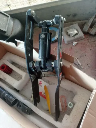 Suspensión para patinete eléctrico de la marca 🦘M. No lo que es el tubo deberían cambiarlo eso vale 10 euros ya que fue modificado para alargarlo Y le falta una cabeza de un pasador - Diseñada para mejorar la experiencia de conducción. - Fabricada con materiales de calidad. Me costó 90 euros