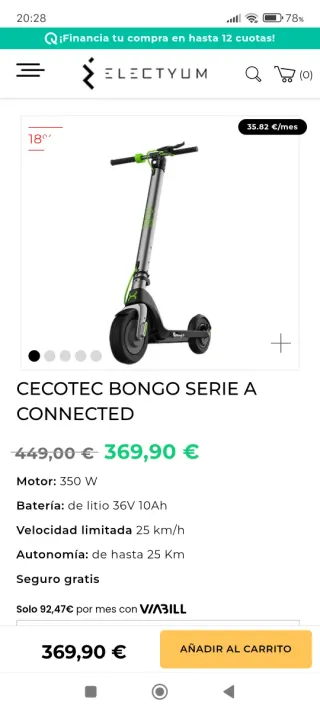 Patinete eléctrico Cecotec Bongo Serie A Connected en color gris y verde. - Motor de 350 W. - Batería de litio 36V 10Ah. - Velocidad limitada a 25 km/h. - Autonomía de hasta 25 Km. - Incluye seguro gratis.