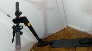 Patinete eléctrico de color negro con detalles en marrón en los mangos. - Manillar con pantalla digital. - Luces LED integradas.