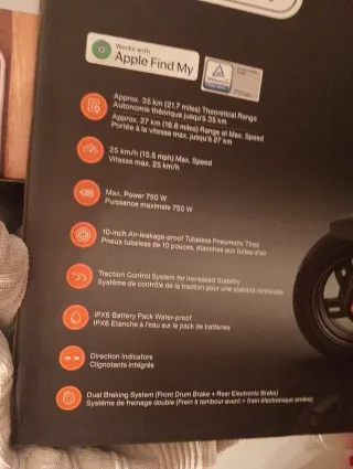 •Velocidad máxima: hasta 25 km/h •Autonomía: hasta 35 km (según uso y peso) •Motor trasero potente (350 W nominal / hasta 750 W máx.) •Ruedas tubeless de 10” (más estabilidad y menos pinchazos) •Doble sistema de frenado: tambor delantero + freno eléctrico trasero Resistencia al agua IPX4 •Luces LED delanteras y traseras + intermitentes integrados •Pantalla digital y conexión con app Segway/Ninebot •Plegable, fácil de transportar •Peso: aprox. 18,8 kg