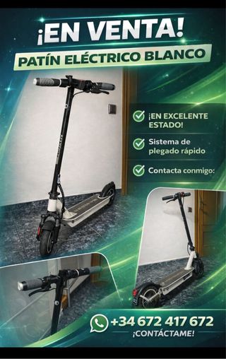 Se vende patín eléctrico en color blanco. Se encuentra en excelente estado y cuenta con un sistema de plegado rápido. - ¡En excelente estado! - Sistema de plegado rápido. - Contacta conmigo: +34 672 417 672
