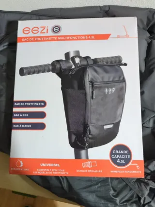 Bolsa multifunciones para patinete eléctrico de la marca Eezi. - Capacidad de 4.5L. - Resistente al agua. - Compatible con todos los modelos de patinete. - Correas ajustables. - Múltiples compartimentos de almacenamiento.