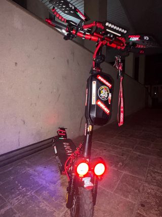 Patinete eléctrico con un diseño único y personalizado. - Manillar rojo y negro con puños de alta adherencia. - Bolsa frontal negra con detalles de Ducati. - Luces LED delanteras y traseras. - Llantas todoterreno.