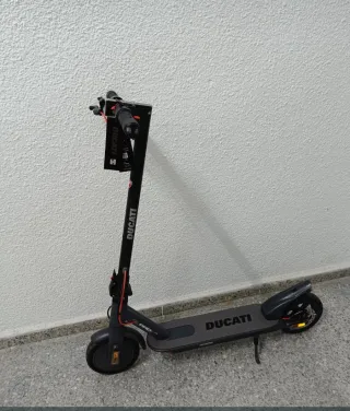 Patinete eléctrico de la marca Ducati, con un diseño inspirado en las motocicletas. - Color negro y detalles rojos. - Logo de Ducati en el manillar y la base. - Nuevo sin entrenar con garantía y caja.