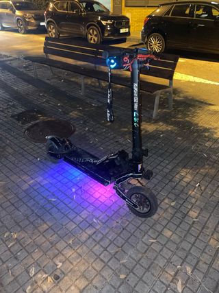 Patinete eléctrico con un diseño llamativo y luces LED. - Luces LED verdes en el mástil. - Luces LED rojas en la parte trasera. - Luces LED azules en la base. - Faro delantero blanco. Esta nuevo porque hace mucho espacio