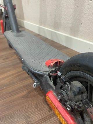 Patinete eléctrico Xiaomi en color negro. Tiene la rueda trasera petada y le falta el guardabarros trasero. Por lo demás perfecto. Tiene poco uso. Mejor verlo. - Diseño plegable para facilitar su transporte. - Ruedas con detalles en rojo.