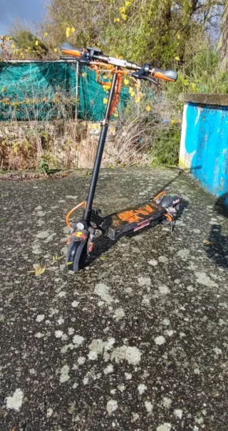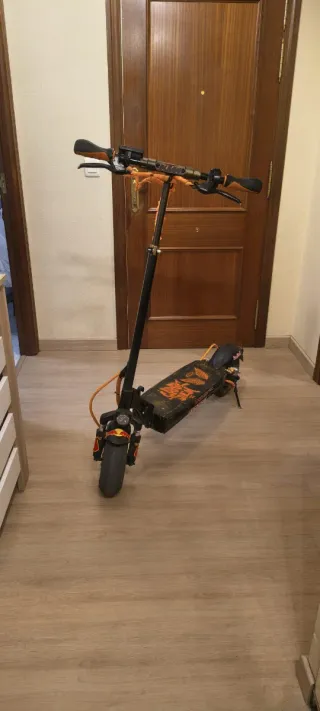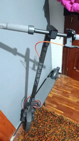 Patinete eléctrico de color negro con detalles en naranja. Está como nuevo - Manillar con puños naranjas. - Rueda delantera negra. - Rueda trasera con detalles rojos. - Freno de disco atrás