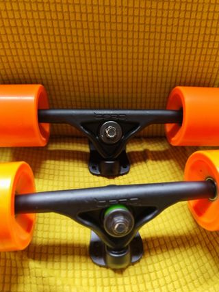 Longboard en excelente estado, prácticamente nuevo. - Tabla de madera con diseño de rayas. - Ruedas amarillas. - Trucks negros.