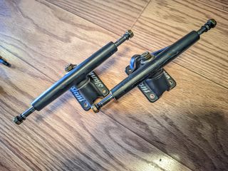 Longboard RKP trucks. Manufacturer: Slant Size: 150 mm Total width: 215 mm Bushings durometer: 92.5a Condition: Barely used 180 mm hanger available. Golden or silver baseplate available. Open to offers !! Check my profile for additional skate hardware and accesories !!