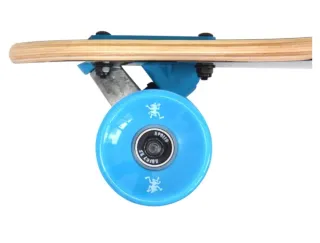 Longboard de la marca Maui and Sons con un diseño llamativo. - Tabla con acabado en madera clara. - Adhesivo circular con logo de Maui and Sons. - Ruedas de color azul.
