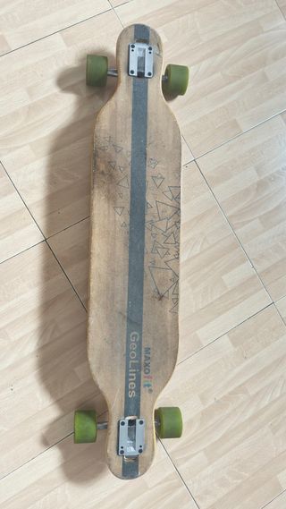 Longboard MAXOfit GeoLines con un diseño tribal y geométrico. - Tabla de bambú con diseño grabado. - Ruedas verdes. - Ejes metálicos.