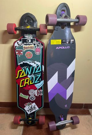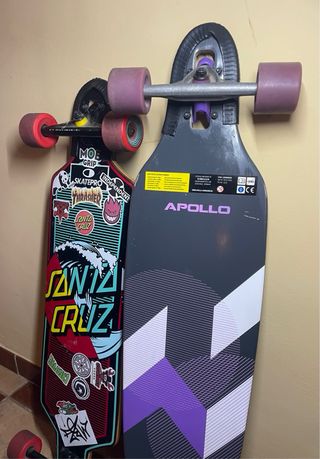 Dos longboards para disfrutar del skate, el paisaje y el buen tiempo! - Longboard Santa Cruz con diseño gráfico original con poco uso. - Longboard Apollo de color gris con detalles morados original con poco uso. - Ruedas de colores para ambos longboards a juego con cada diseño del mismo. PRECIO POR CADA UNA 80€