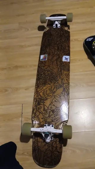 Longboard con un diseño único y llamativo. - Tabla de madera con detalles en color marrón. - Adhesivo de un demonio blanco en el centro. - Ruedas de color verde claro. - precio negociable.