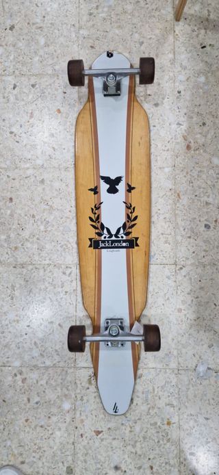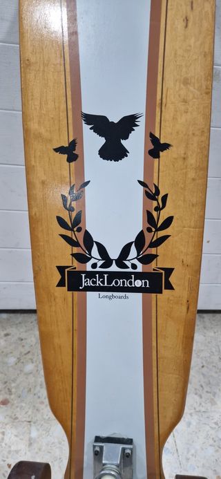 Vendo Longboard de la marca Jack London. Es una tabla completa (tabla, ejes y ruedas originales de la marca) con un diseño clásico muy bonito en madera vista. Características: Estilo Pintail: Tiene forma de lágrima o "surfera". Esta forma es la mejor para "Cruising" (pasear por el paseo marítimo, carril bici o parque) y "Carving" (hacer giros amplios como en el surf). Diseño: Gráfico elegante con cuervos y laureles sobre la madera. Ruedas: Originales Jack London, son anchas y blandas para absorber bien las vibraciones del asfalto rugoso.