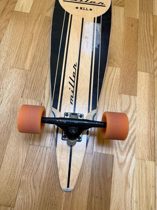 Longboard de la marca Miller con un diseño llamativo y ruedas de color naranja. - Diseño con rayas verticales negras y detalles en madera. - Ruedas de color naranja. - Logo de Miller con alas en la tabla.