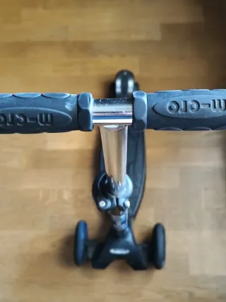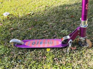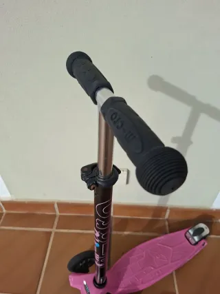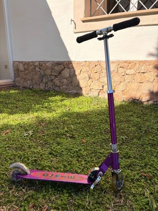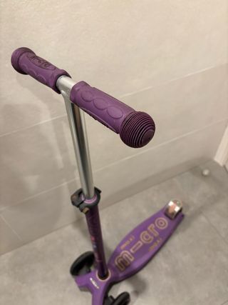 Patinete infantil de la marca Mini Micro en color morado. Ideal para los más pequeños. Las ruedas están perfectas y la plataforma también. La goma de los puños del manillar está desgastada del uso pero no afecta al funcionamiento y se puede seguir usando sin problema. - Tres ruedas para mayor estabilidad. - Manillar ajustable en altura. - Plataforma antideslizante.