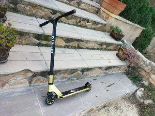 Patinete acrobático Micro MX Crossneck en color negro y dorado. Diseñado para trucos y freestyle. - Manillar negro. - Base y ruedas doradas. - Ruedas de 80mm.