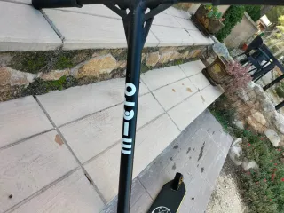 le falta el freno que se puede comprar en la web de Micro funciona perfectamente empuñadura algo rota en laterla se separa en dos para transportar