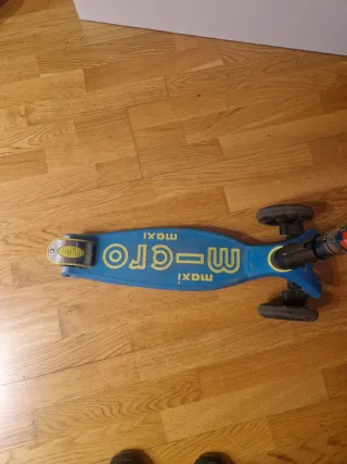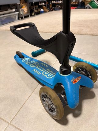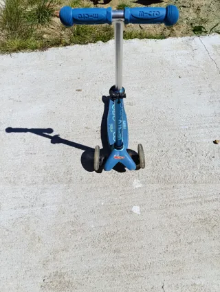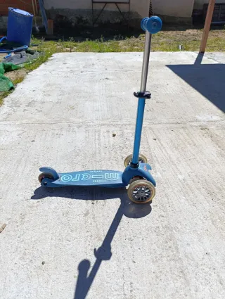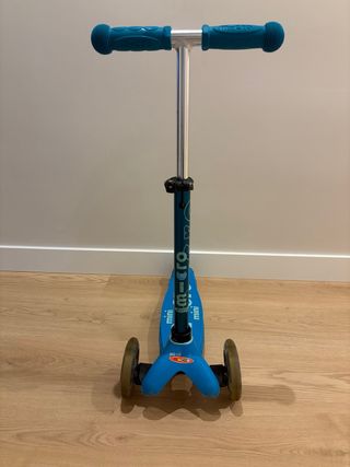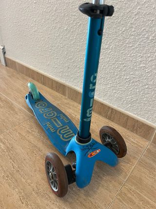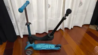 Patinete infantil de tres ruedas de la marca Micro Mini. Lo compramos nuevo y solo ha tenido un uso. Le falta el freno por eso está bien de precio - Color azul. - Manillar con puños verdes. - Ruedas delanteras dobles.