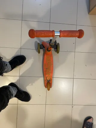 Patinete de la marca Micro en color naranja. - Plataforma antideslizante. - Ruedas para un desplazamiento suave. - Manillar ajustable.