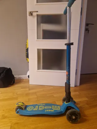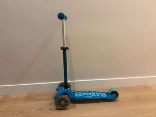 Patinete de la marca Micro en color azul. Ideal para desplazamientos urbanos. Ruedas con luces - Manillar ajustable. - Ruedas de goma. - Plataforma antideslizante.